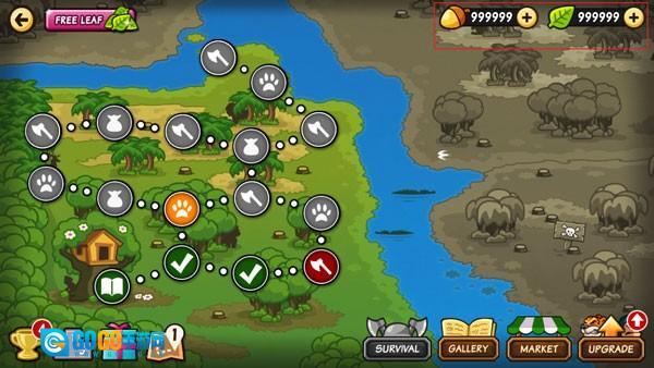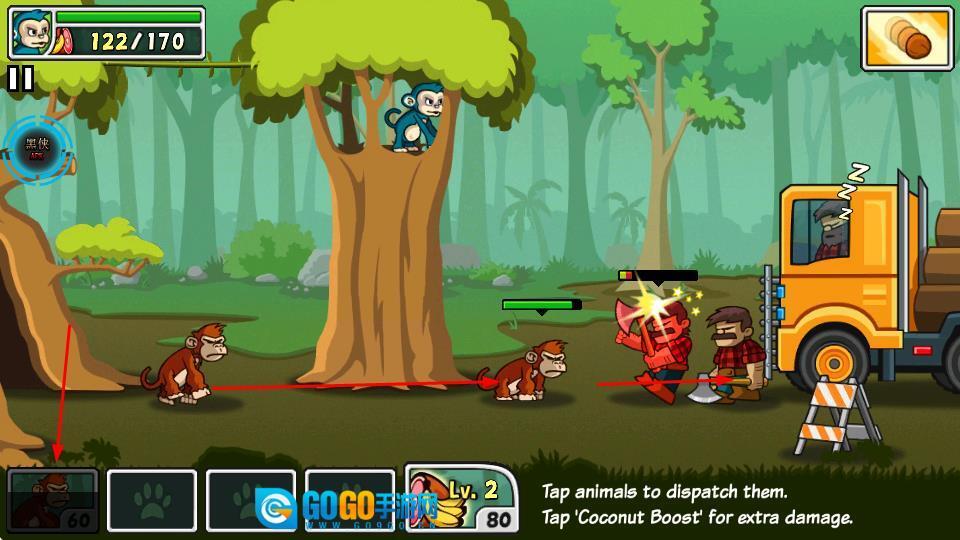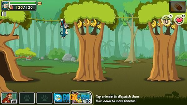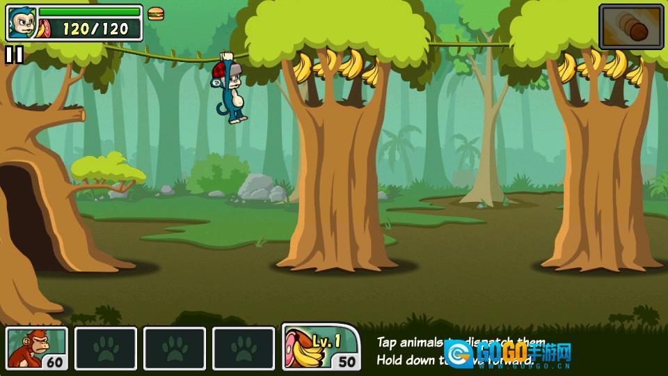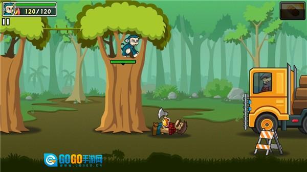 在树上能获取香蕉之类的资源,提升分数,还可以召唤其他动物帮忙战斗。