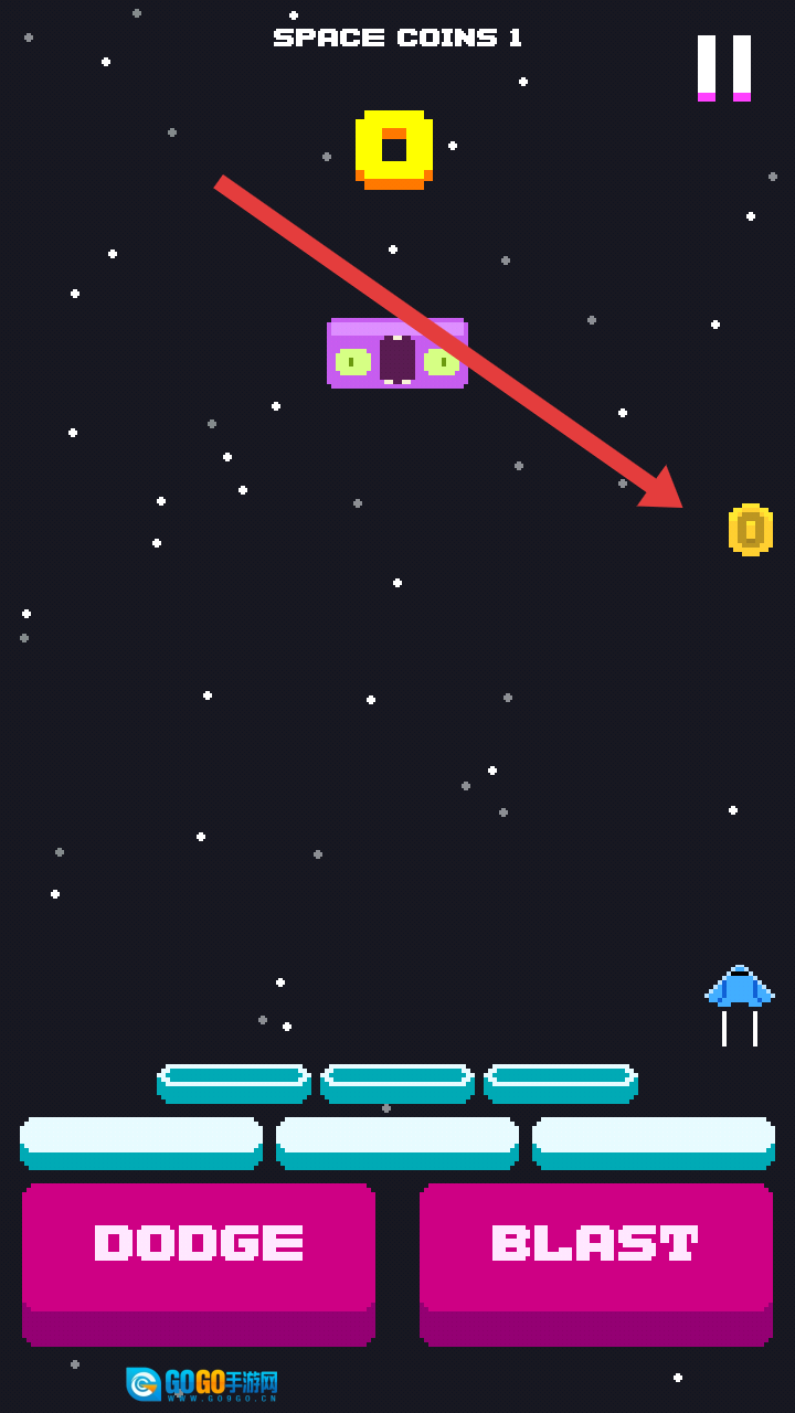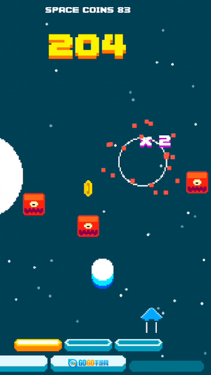 灵活操控飞船移动,拾取场景中的金色硬币以积累资源,同时收集黄色武器升级道具,以此强化自身的战斗能力。