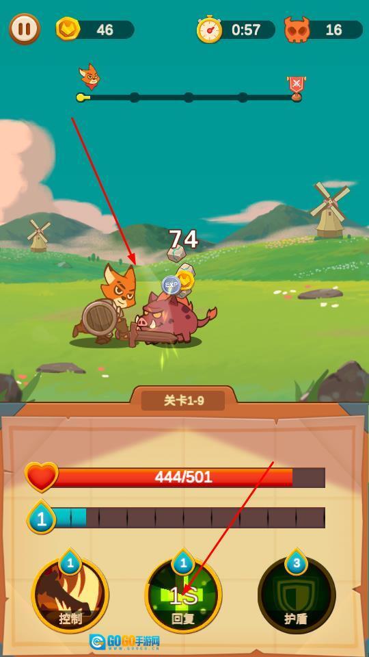 战斗时操控福尼去攻击野猪这类怪物,要留意上方显示的计时(比如0:57)和剩余怪物数量(比如16只),同时观察血量条的数值情况(比如444/501),以此来把控好战斗的节奏。