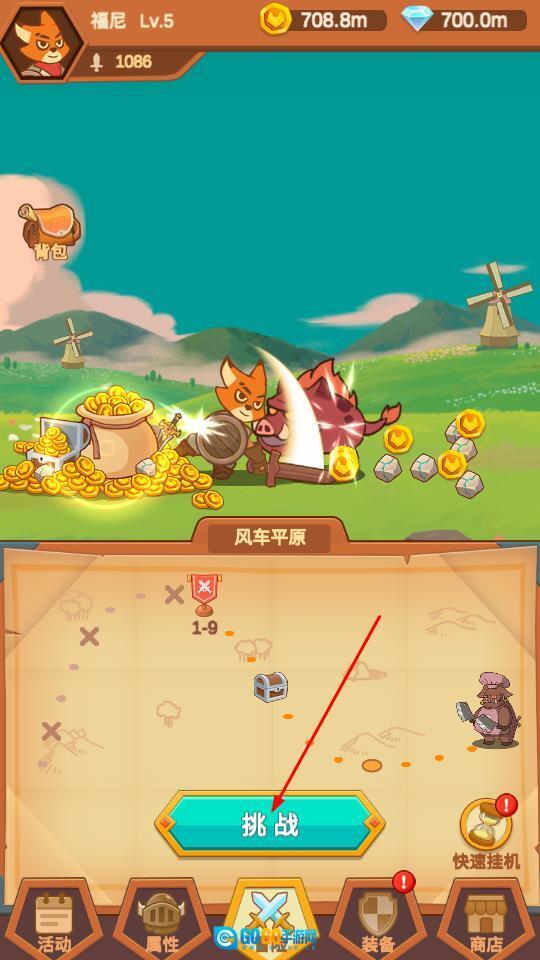 在冒险界面点击挑战按钮,进入风车平原的关卡(例如1-9),角色福尼(等级5级)开启战斗,界面会显示金币、钻石以及战力数值。