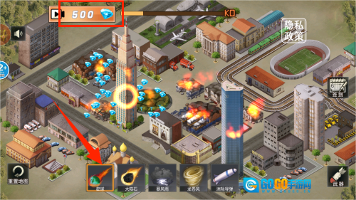当选中星球图标时,会触发行星坠落的场景,每成功摧毁一座建筑就能得到晶石奖励。