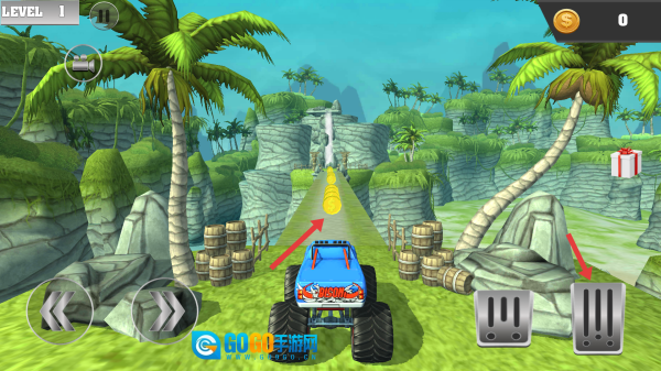 左侧箭头控制方向,右侧按键操控油门与刹车,驾驶蓝色卡车顺着指定路径前进,收集沿途的金币。
