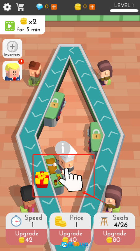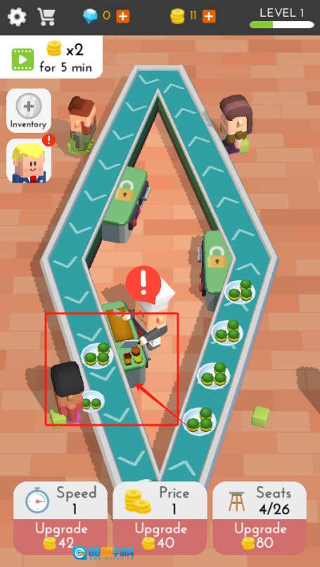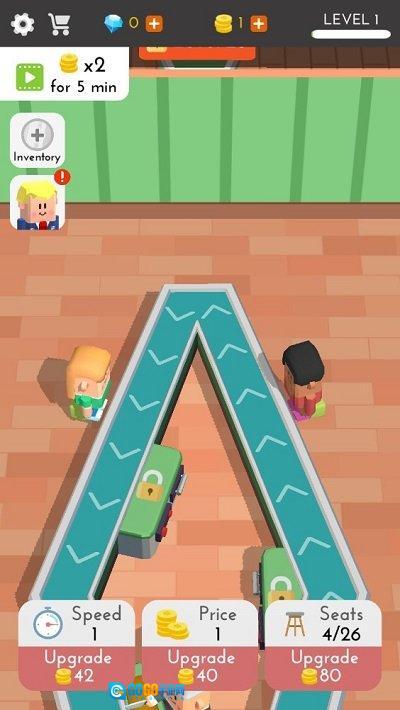 点击升级按钮消耗金币,可提升速度、价格或增加座位数;厨师正在烹饪菜品,传送带则负责传送餐食。