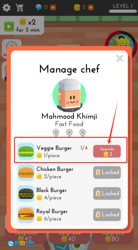 进入管理厨师的界面后,能够对蔬菜汉堡进行升级操作,不过其他种类的汉堡目前仍处于锁定状态,暂时无法购买。
