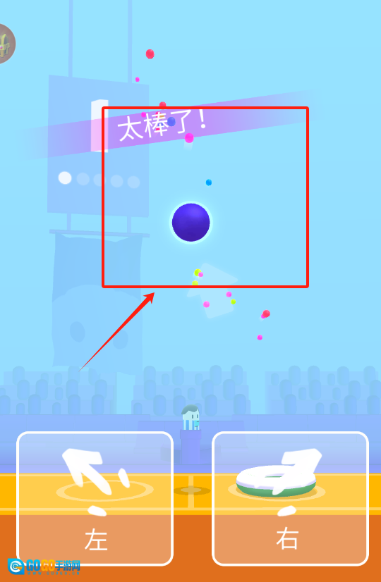 当看到“太棒了”的提示时,迅速点击左右按钮,帮助蓝球避开障碍、持续向前移动。