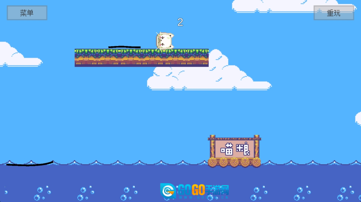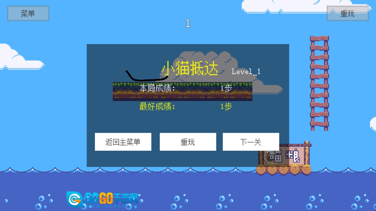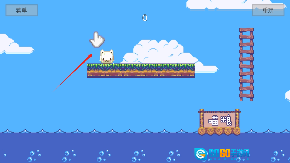 在关卡1的游戏界面里,你需要操控那只白色小猫在各个平台间灵活移动,巧妙避开途中的障碍,最终顺利抵达喵粮所在的位置。