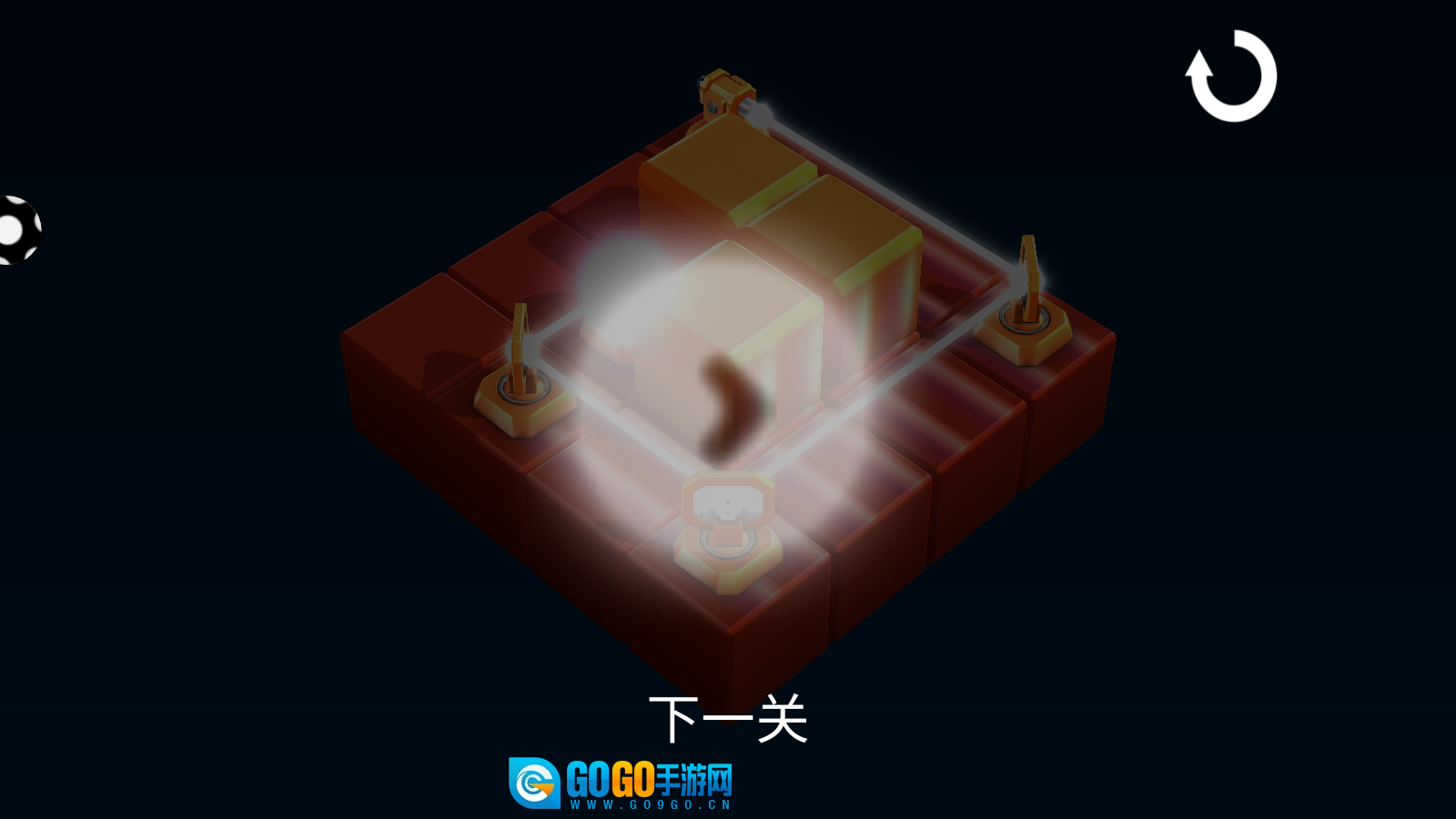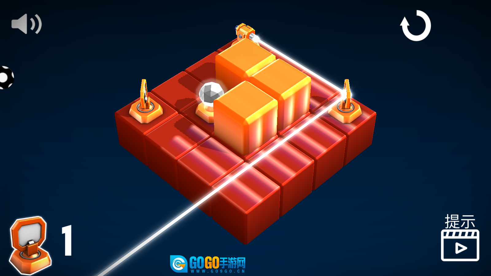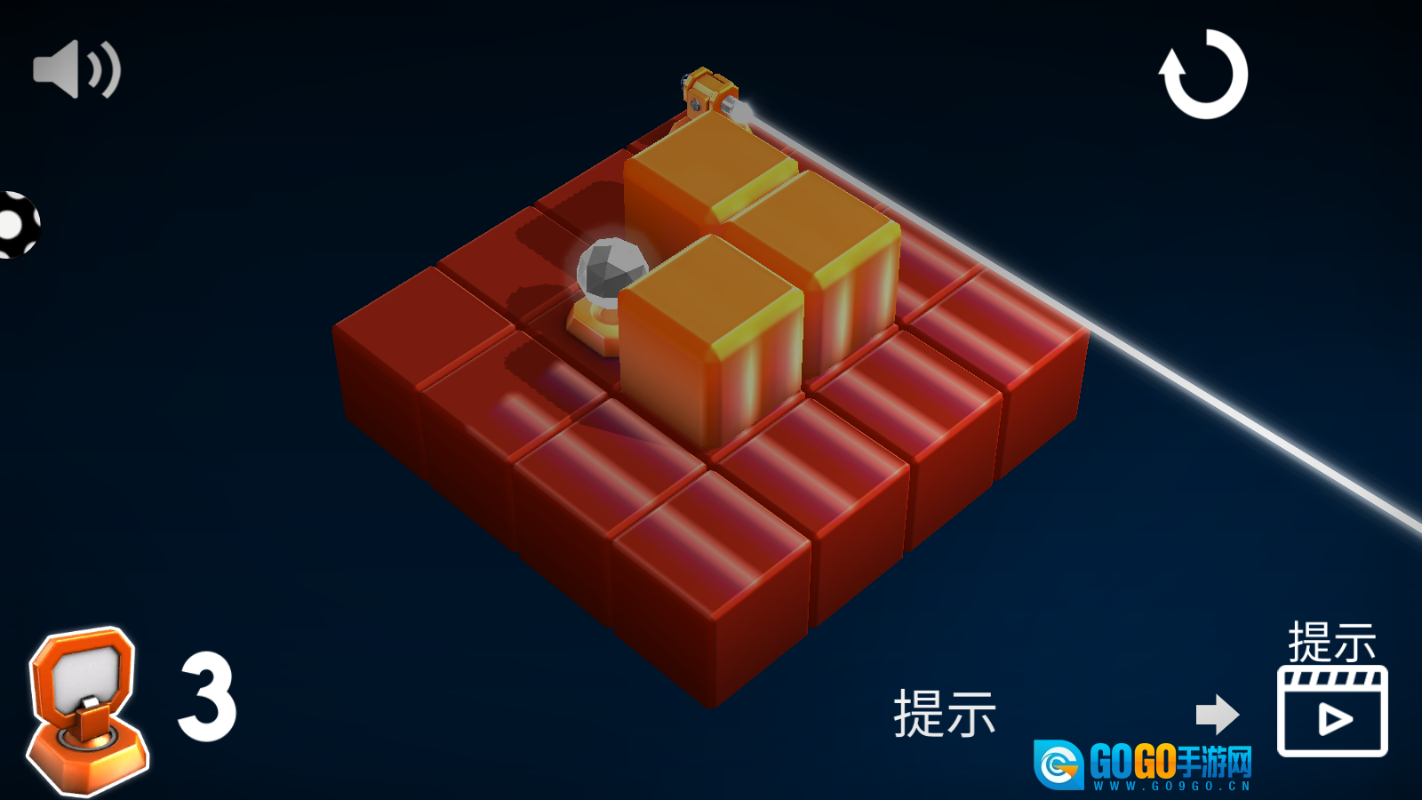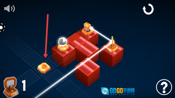 进入关卡后,仔细观察红色方块与激光的布局,利用左下角的道具来调整光线的行进路径,收集场景中的金色物件,以此推动机关解锁并推进关卡进程。