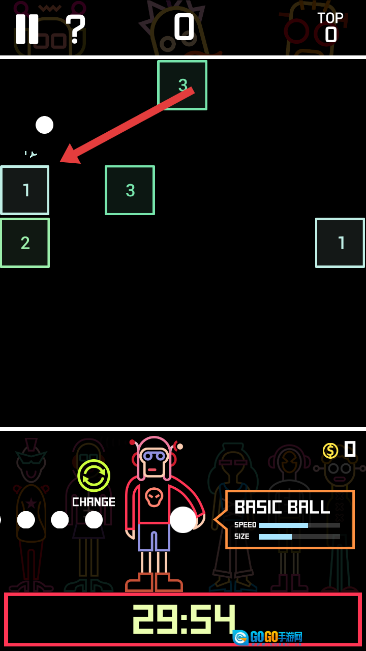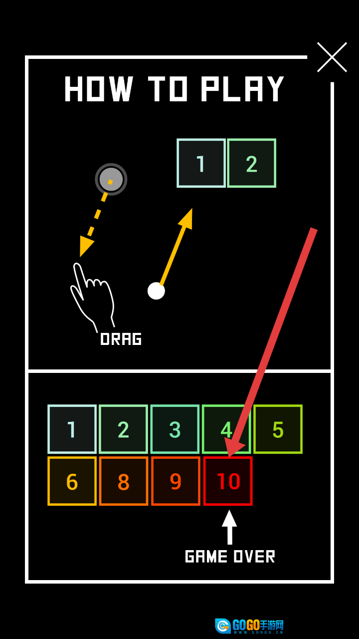 查看教程学习拖动发球(DRAG),撞击数字方块,避开红色的【10】方块,一旦触碰就会GAME OVER。