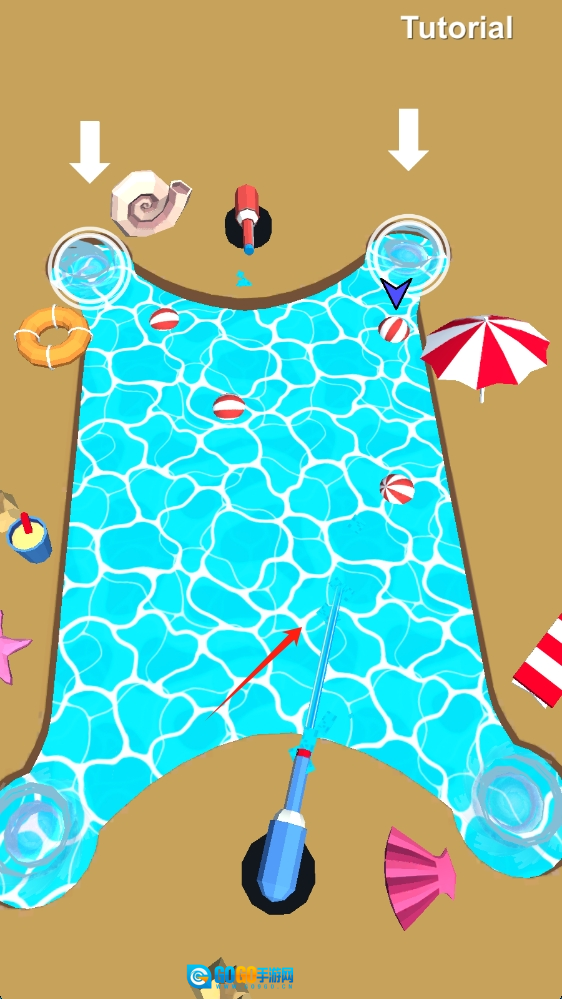 在教程环节中,跟随箭头的指示,推动泳池里的球,以此熟悉游戏的操作方式,同时按住按键发射水枪。