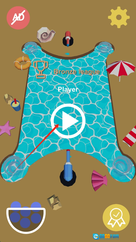 在青铜联赛界面,点击播放按钮,开启泳池主题的休闲游戏挑战,然后点击开始游戏。