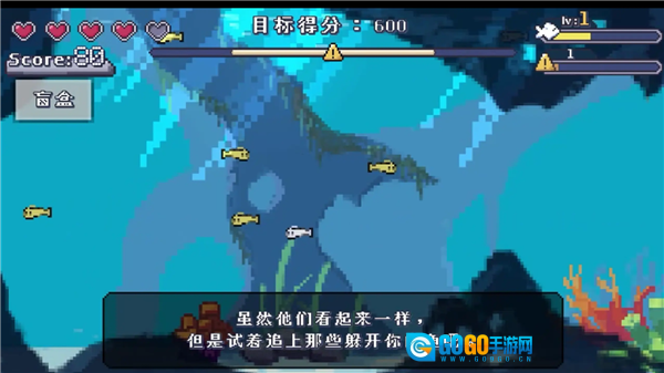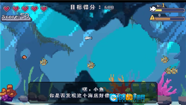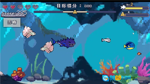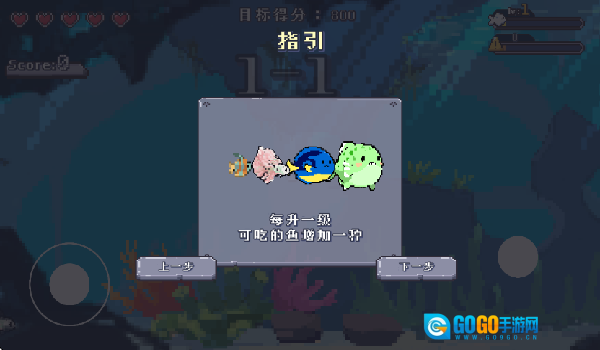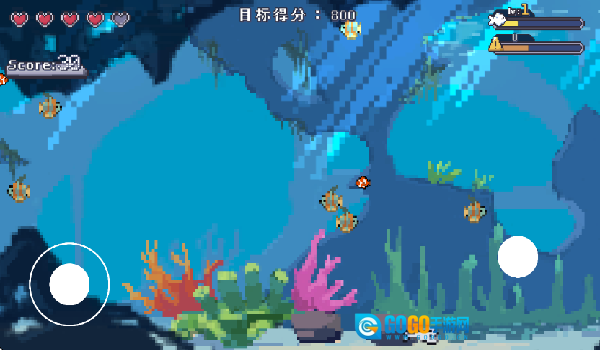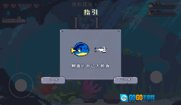 游动时要时刻留意自己的位置,要是被大鱼吞掉就会损失一条生命,左上角的红心一旦消失,就代表闯关失败了。