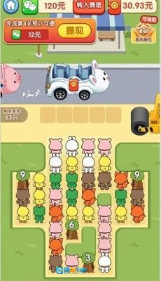 在游戏里,得给相同颜色的小熊配对,再让它们一同乘车。