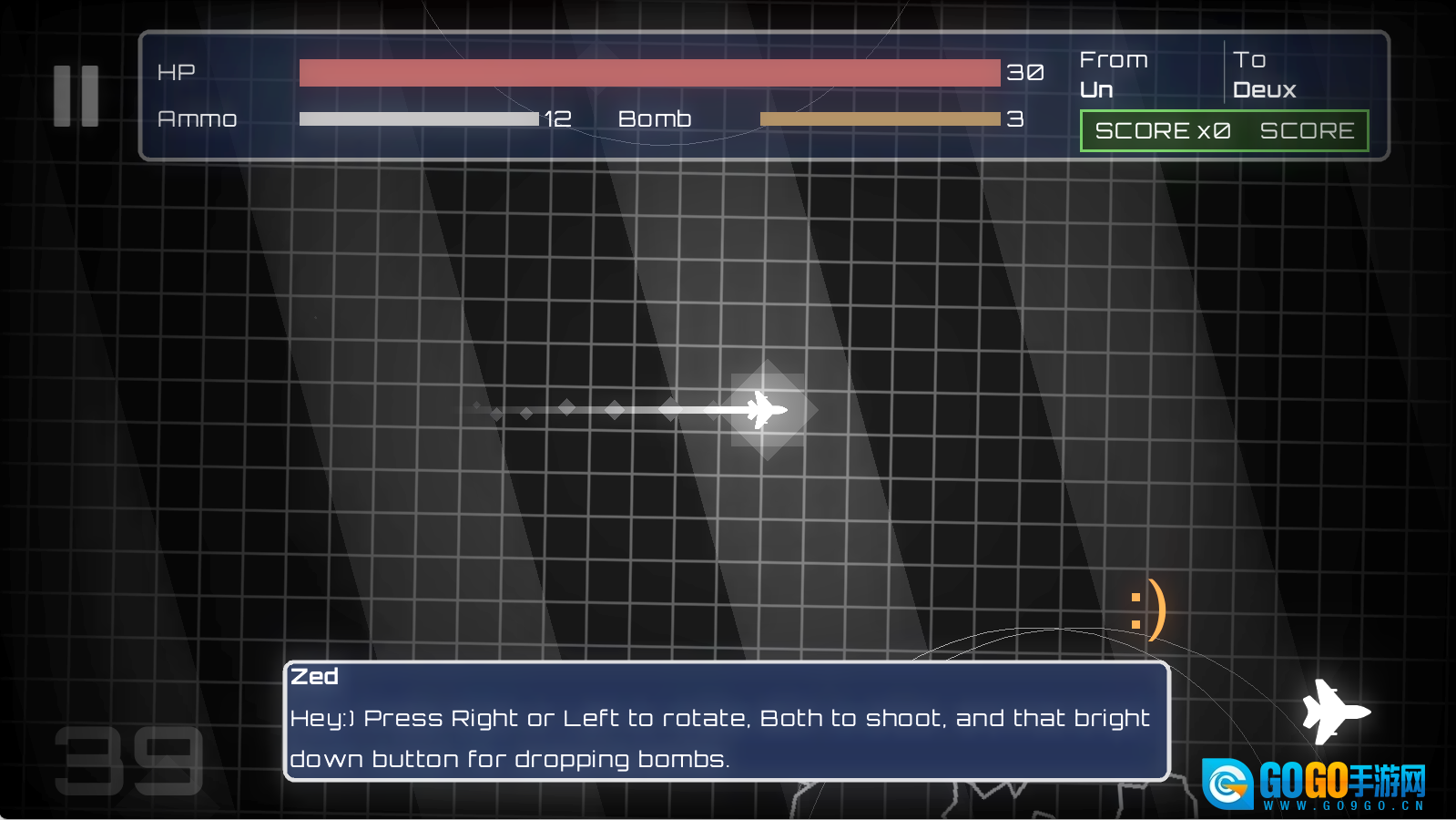在飞行的时候,要留意躲开场景里各种几何形状的障碍物,一旦碰到就会不断减少生命值。