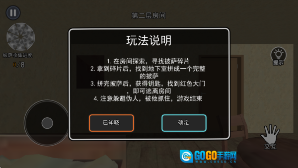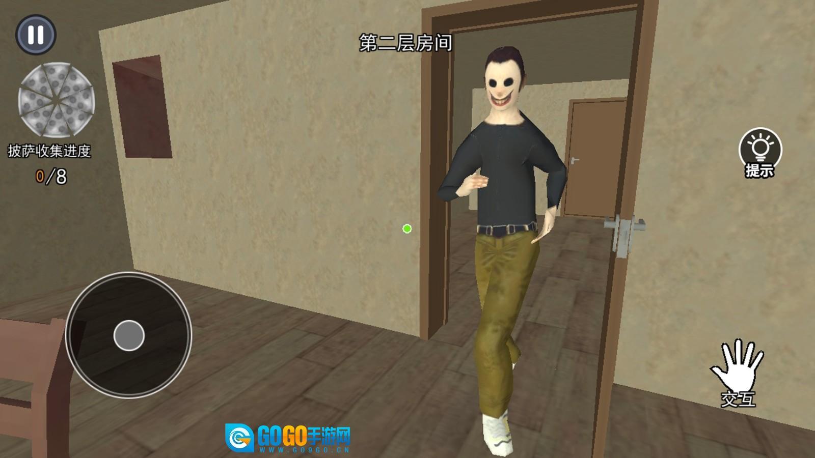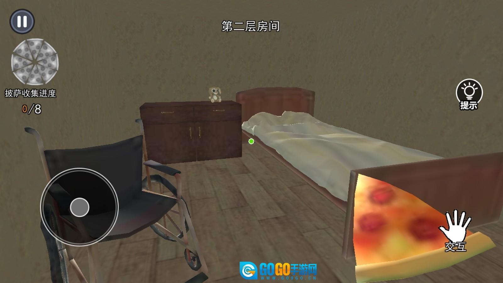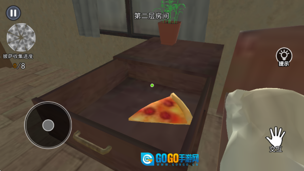 如图所示,我在床边抽屉里找到了第一块披萨,只要把光标移到披萨上就能收集。接下来要继续探索,而且得小心伪人,这样才能顺利逃离!