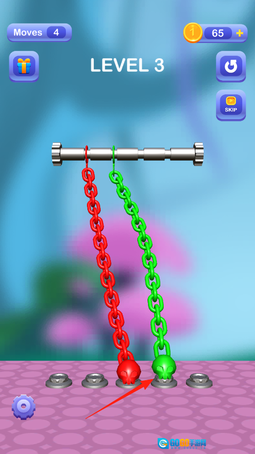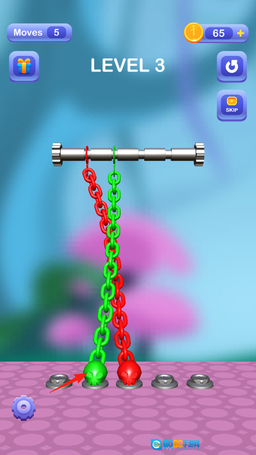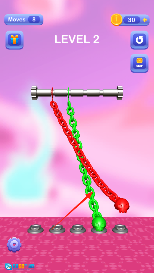 点击链条,调整它在轴上的缠绕状态,规划好移动的路径,把缠绕的部分解开,让骷髅回到正确位置,这样就能完成关卡啦。过程中可以用金币来解锁提示或者道具。