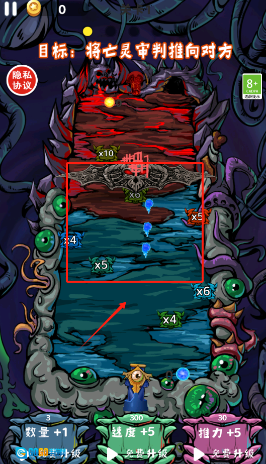 3 、看到带有翅膀的骷髅和倍数标识时,调整角度并滑动屏幕,将亡灵审判推向对面阵营即可。