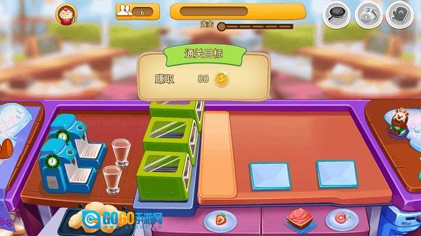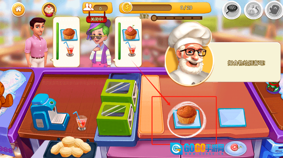把制作好的松饼与饮料递给顾客,柜台上摆放着食物,目前已完成11/20的任务。