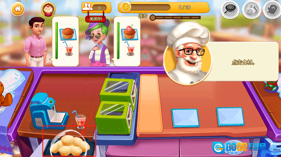 点击松饼食材即可启动制作流程,同时留意右上角的订单信息,当前需完成0/20个任务目标,制作时请注意观察连击进度条的变化。