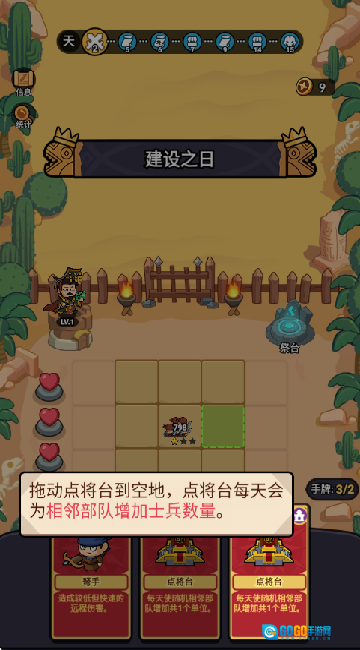 拖动点将台到空地上,它每天会为相邻的部队增加士兵数量。