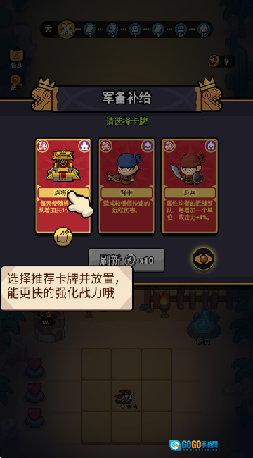 军备补给卡牌会随机出现,你需要挑选系统推荐的卡牌,并将其摆放到对应的位置上。