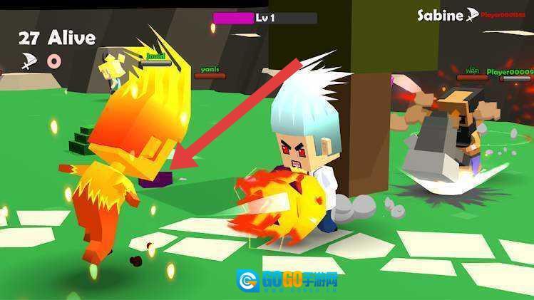 战斗时,控制火焰角色(箭头所指),向敌方角色(比如白发对手)发起攻击,借助技能与武器,将敌人击败。