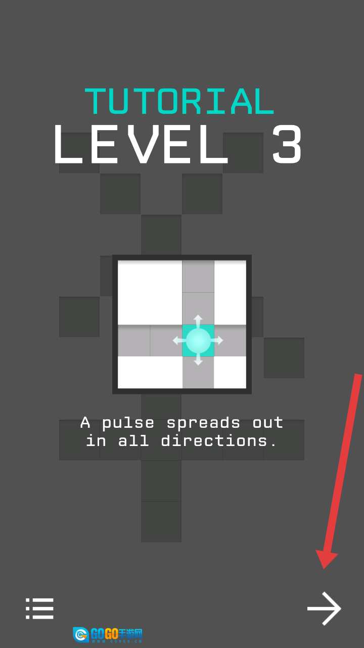 在教程关卡(TUTORIAL LEVEL3)中,点击右下角的白色箭头,按照指引学习脉冲扩散的解谜规则,以此推进关卡进度。