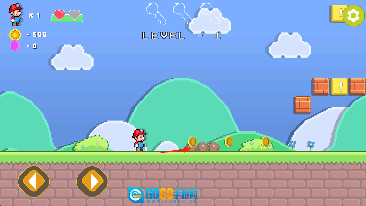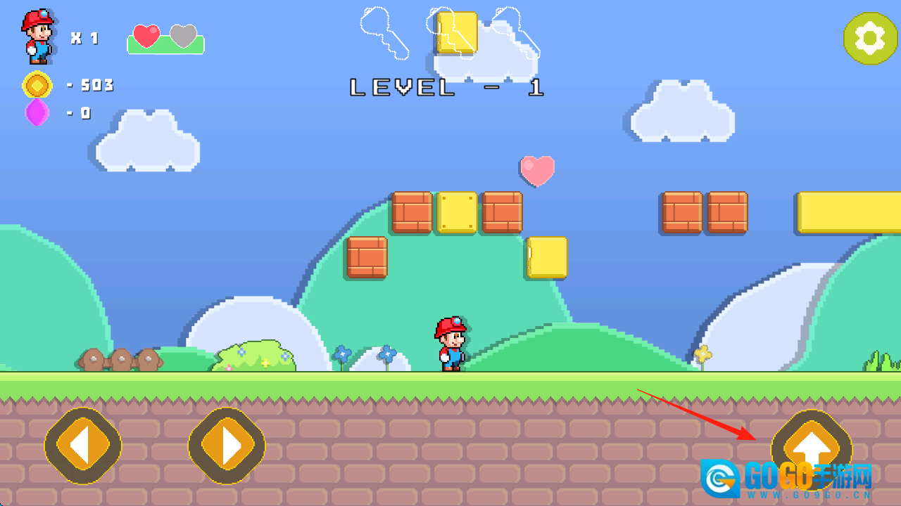 靠近砖块区域(红箭头指示处),长按跳跃键,用头顶破问号砖块,就能拿到爱心金币这样的奖励,接着跨过障碍,继续推进关卡进度。