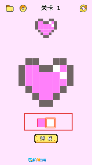 请参照上方小像素心形的颜色分布,选中下方对应的颜色,点击空白像素块进行填充,填充完成后点击【完成】按钮提交。