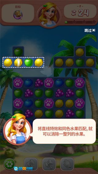 水果也具备特效,消除带有直线特效的水果,就能清除其所在位置那一整列的水果。