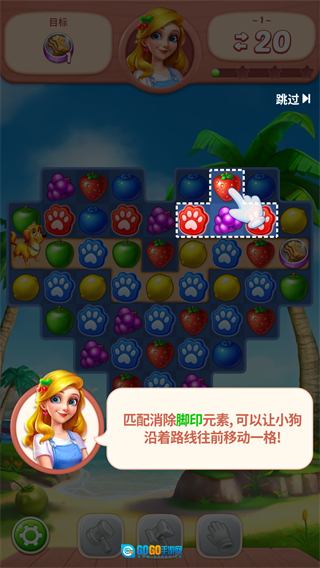 把相同颜色的脚印元素消除即可让狗狗向前走一步;