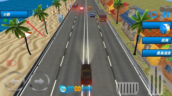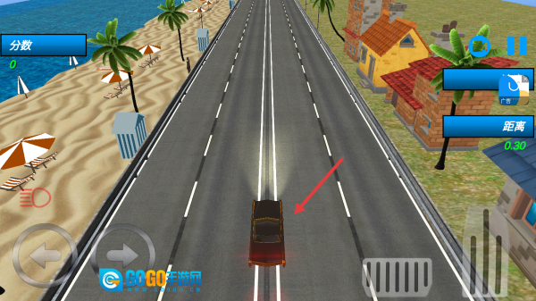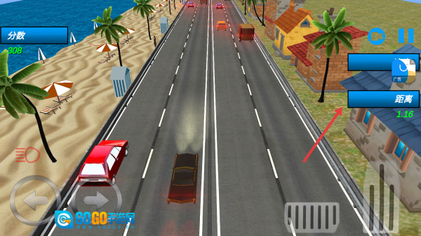 驾驶着黑色轿车行驶在海滨公路上,通过左右按键来控制方向,避开途中的障碍,同时留意“分数”“距离”等相关数据。