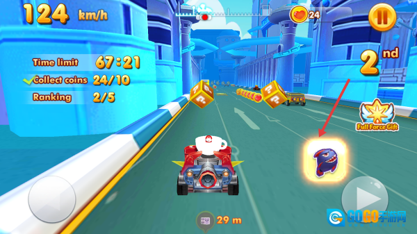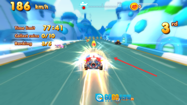 赛道上,操控排名第三的赛车,拾取加速道具,超越粉色和黑色的对手,收集金币。