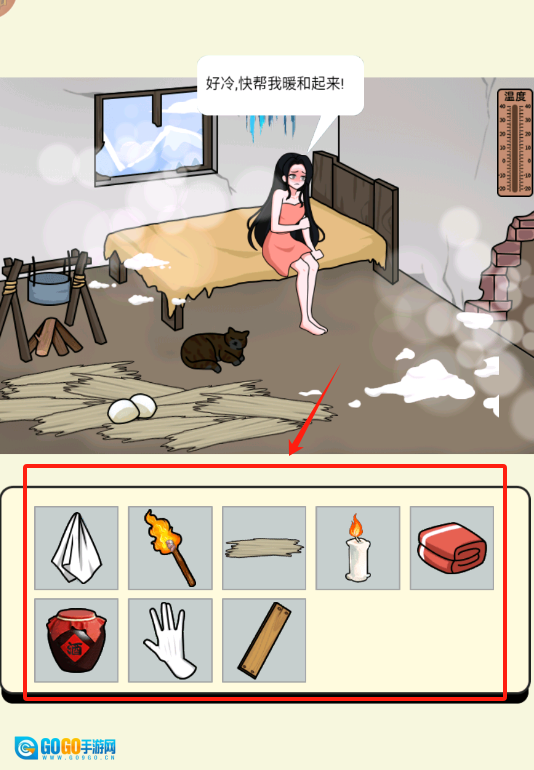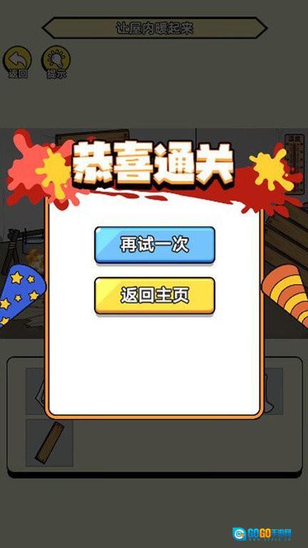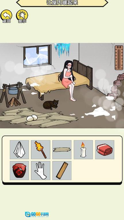 要是碰到难题,可以点击左上角的“提示”按钮来获取线索,也能从九宫格的道具栏里选择合适的物品,一步步让屋内的温度升高。