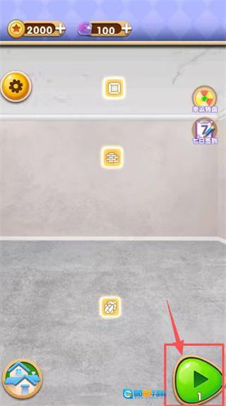 进入游戏主界面,映入眼帘的是紫色菱形与淡紫色背景交织的视觉设计,点击下方绿色三角播放键就能开启关卡,别忘了每日点击右上角转盘图标参与签到活动。