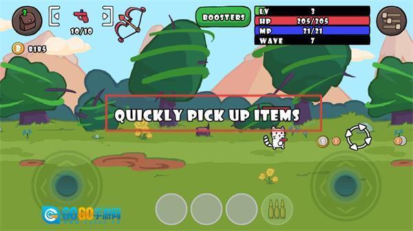 射击战斗玩法:操纵猫咪在场景里移动射击,避开怪物的攻击,借助不同枪械的特性进行输出,感受畅快的射击冒险。