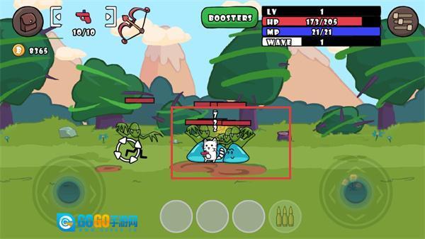 进入关卡后,玩家需要操控猫咪使用枪械来对抗怪物,并依据敌人的属性切换武器和角色。