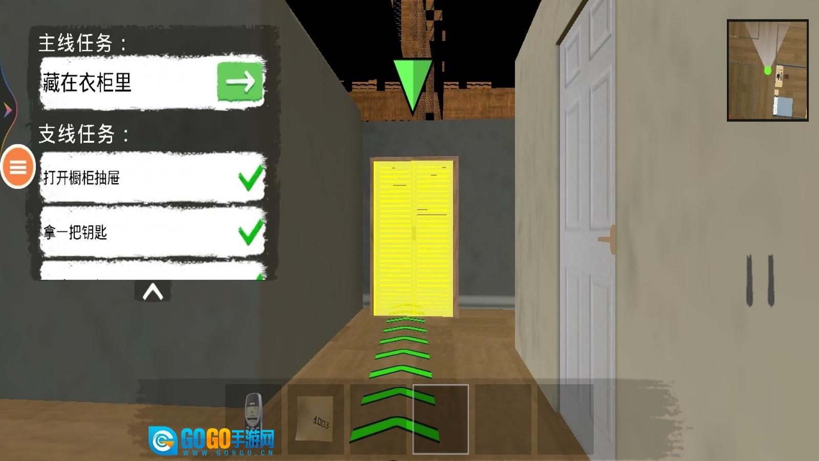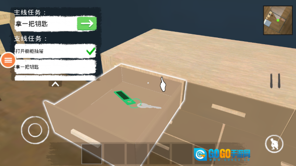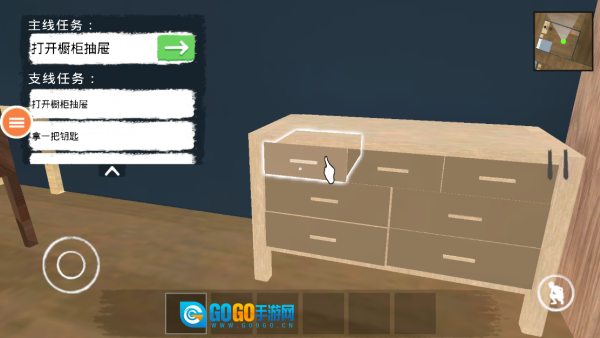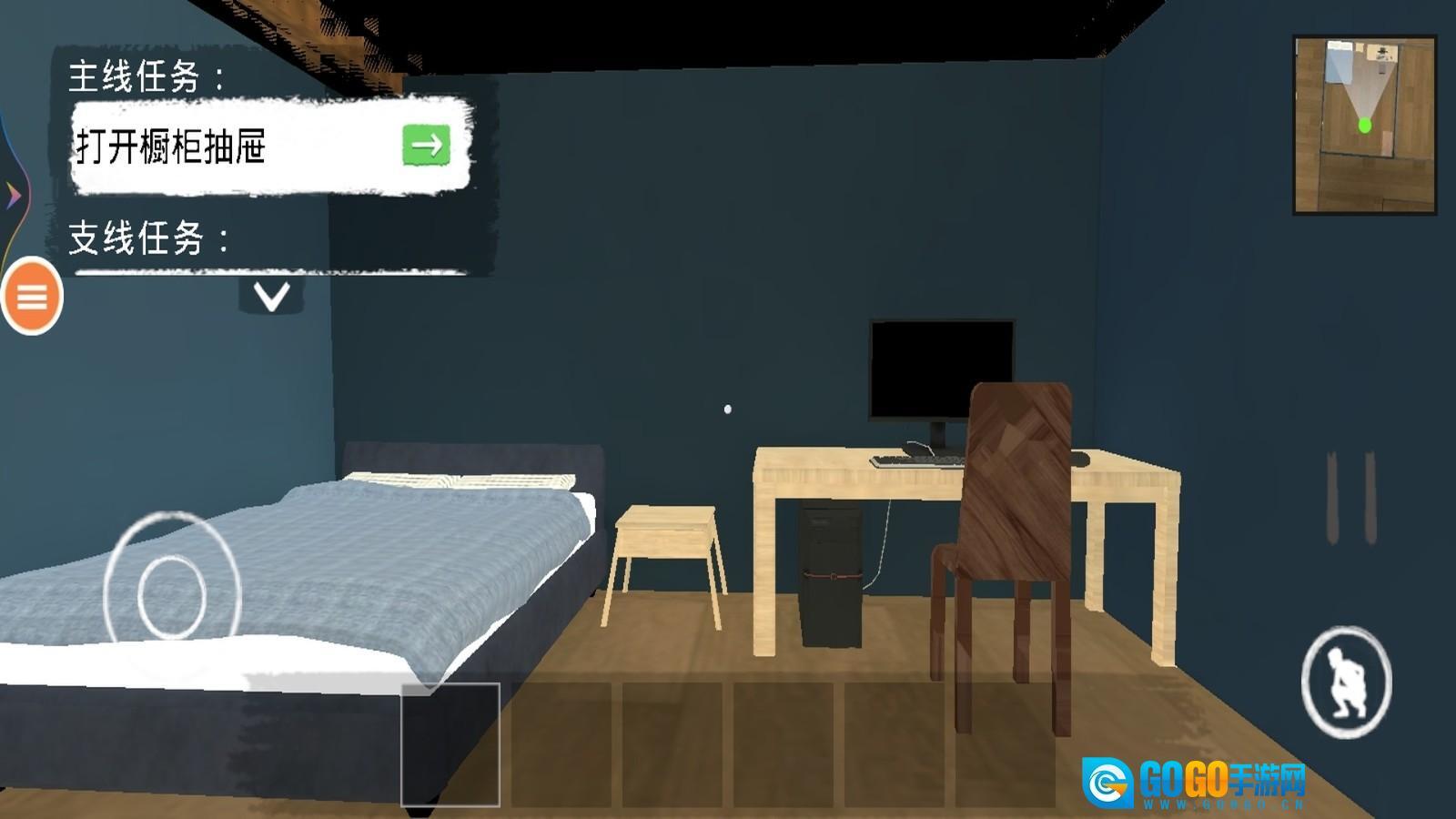 现在你在自己的房间里,留意画面右上角的小地图,就能看到自己的位置。画面左边会有任务提示。