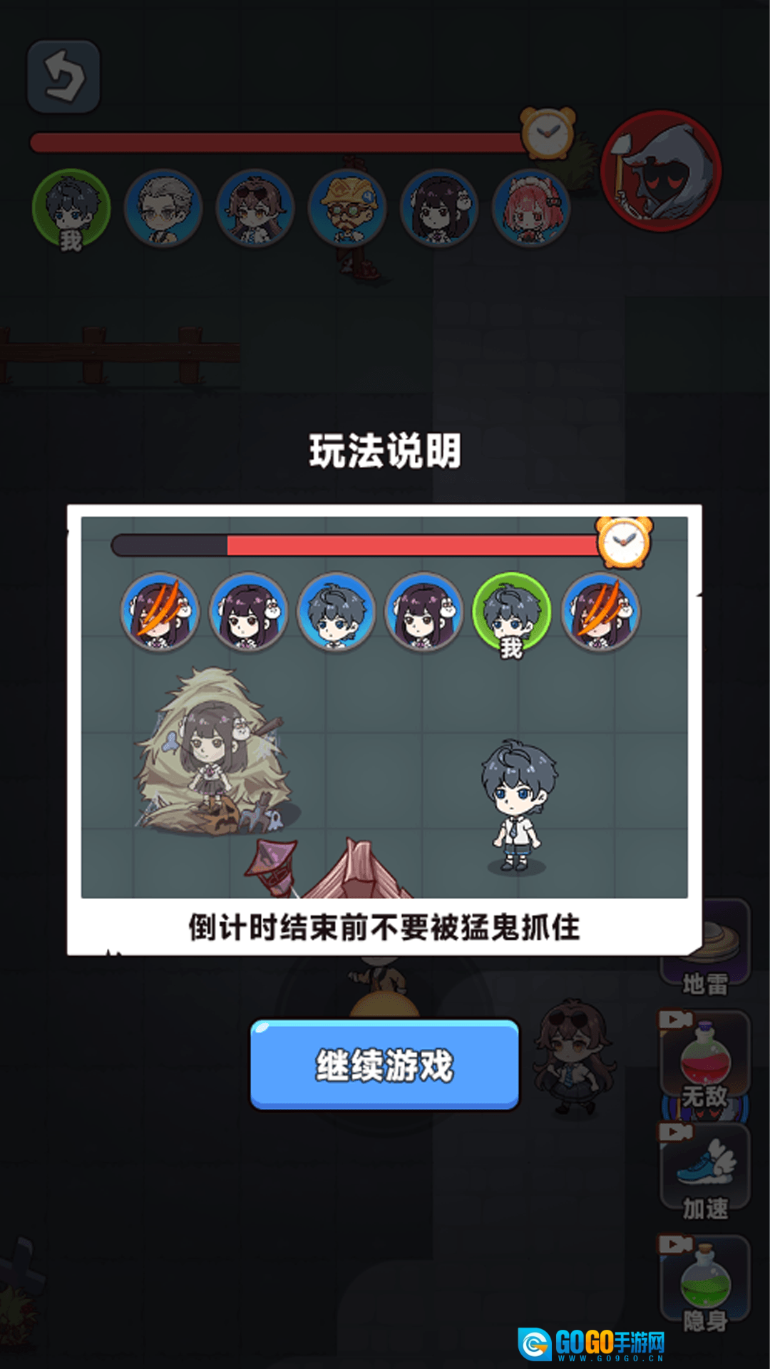 进入地图后,玩家得避开怪物的追捕,找个安全之处藏起来,要是能撑到时间结束就算赢!