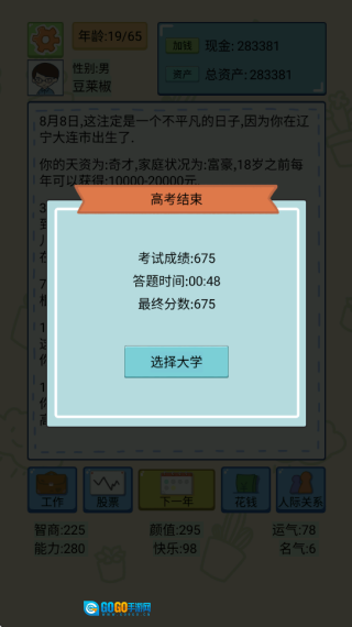 接下来玩家得通过答题来完成高考,就像下面这张图展示的那样,之后你就能依据自己的高考分数挑选不同的大学了。