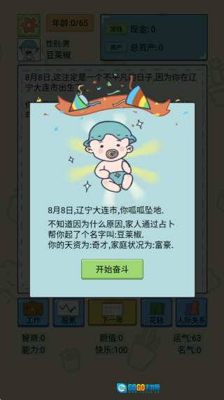就像下图展示的那样,玩家会得到随机的初始出生设定。点击“开始奋斗”按钮,就能开启专属于你的故事新篇章,踏上全新的人生旅程啦。