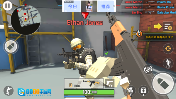 玩家借助虚拟摇杆操控角色移动,角色会自动锁定视野范围内的敌人,点击射击按键就能发起攻击。