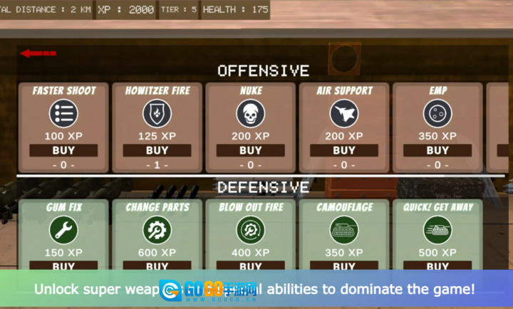 玩家可以通过完成任务来获取金币与经验,这些资源能够用于提升坦克引擎、装甲等基础性能,也可以用来解锁导弹、电磁炮之类的特殊武器系统。