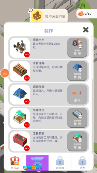 点击画面下方的“制作”按钮,就能看到所有可制作的设施列表。玩家需要收集充足的资源,逐步解锁这些设施,以此来增强自身的生存能力。
