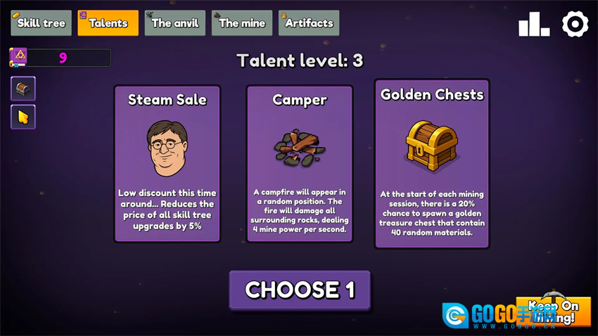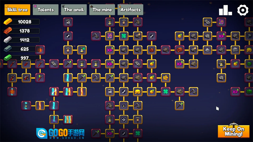 把采集来的矿石熔化成锭,这些锭可以用来打造更高级的镐具,或者用来解锁技能树的节点,从而永久提升开采相关的属性和效率。