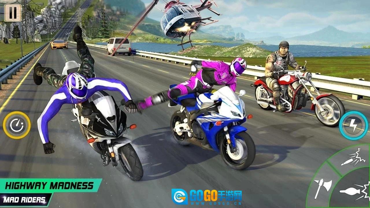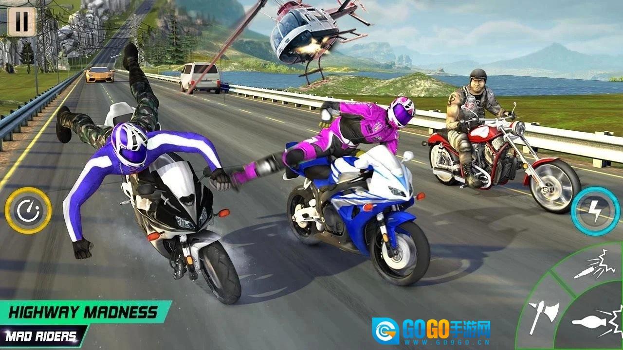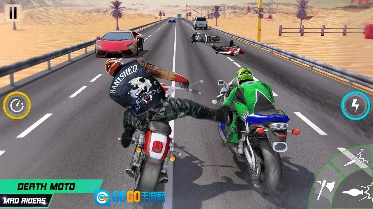 《公路死亡摩托》v1.0.1是一款超有趣的赛车竞速游戏,在这个游戏里,比赛可以说是没有任何规则限制的。玩家能自由进行选择,还能不断秀出自己的摩托车特技,甚至可以用武器攻击其他车手。游戏采用了真实的3D引擎制作,大家快来试试吧!