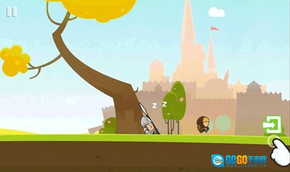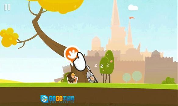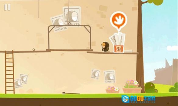 把人物挪到图里标的位置,点一下手掌形状的图标,绳子就会解开,中间的平台就会掉下去。