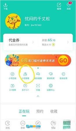 接下来,点击屏幕上的“小号管理”选项(即图中黄色圆圈标注的位置)。