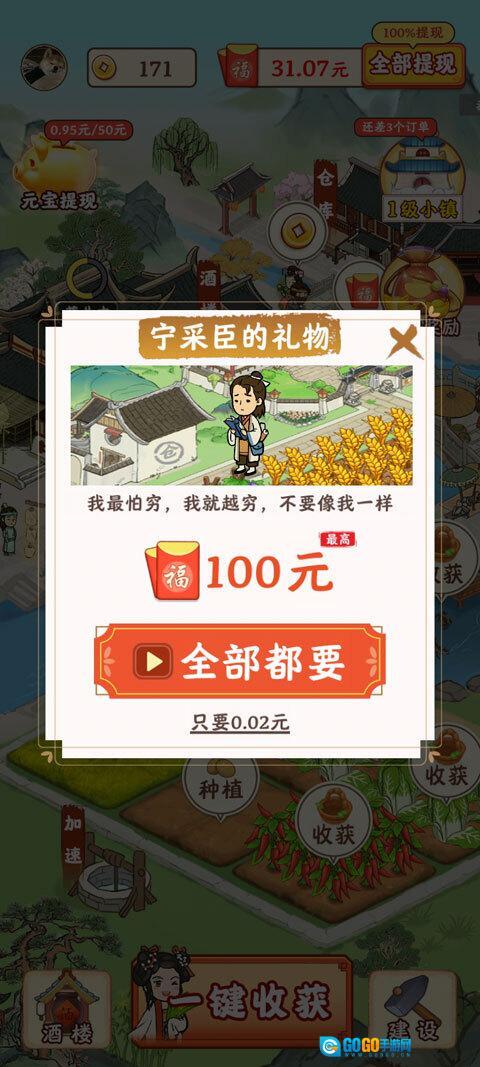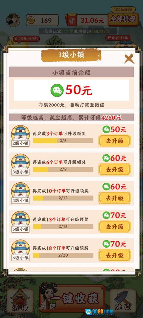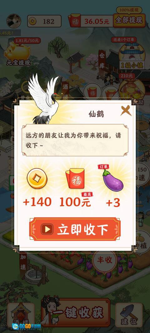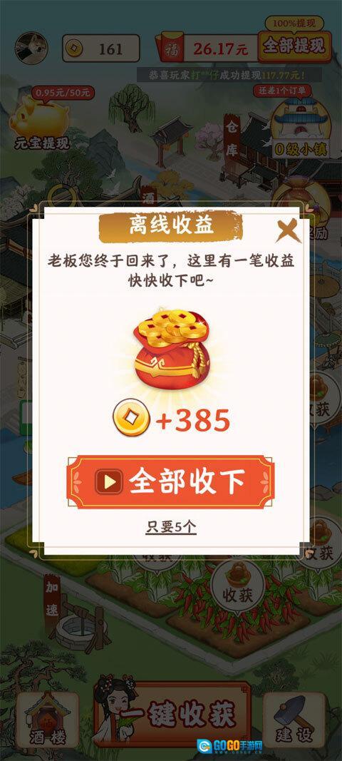进入江南小镇红包赚钱版游戏,离线收益可以获得金币