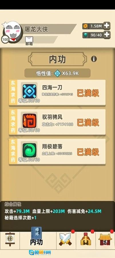 ④别看内功每升一级加的属性不多,但累积起来效果可不小。在还没拿到传奇装备的时候,建议优先把精力放在提升内功上;等拿到传奇装备后,再兼顾着肝内功和搞装备。那些金币不用舍不得花,早晚会用掉的!