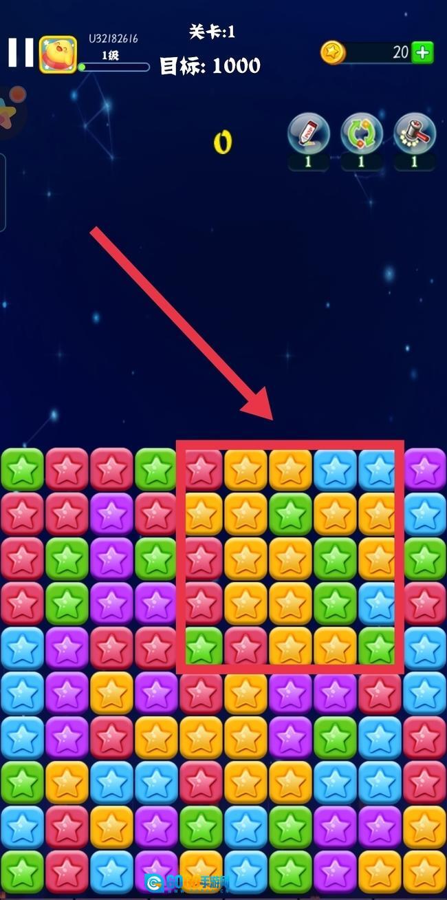 点击颜色相同成块的方块或者星星,即可消除。